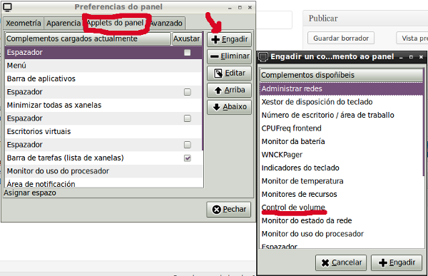 Haz click derecho sobre la barra de tareas y vete a Añadir/Eliminar elementos del Panel. En la ventana que se te abra te encontrarás una pestaña llamada Applets del Panel. Ahí, en los botones de la derecha pulsas Añadir y, en el menú que sale, seleccionas Control de Volumen. (en la imagen de abajo te señalo todo)
