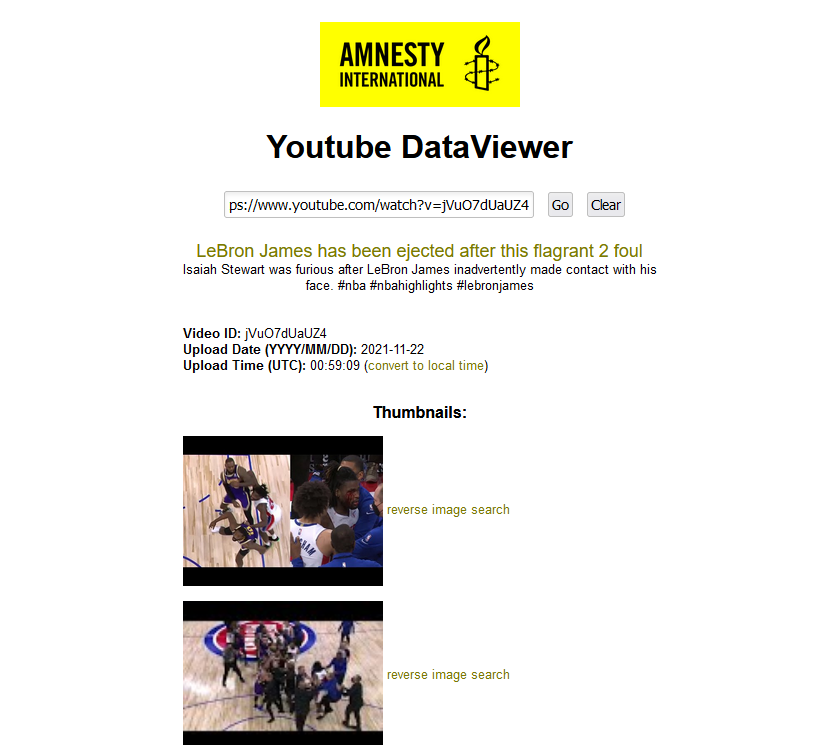 La ONG Amnistía Internacional, por ejemplo, nos ofrece una herramienta para ver metadatos de vídeos de Youtube, lo que nos permitirá saber la fecha y hora a la que se ha subido un vídeo y nos mostrará las miniaturas del mismo para que podamos hacer una búsqueda inversa de imágenes. Lo he probado con un vídeo de esta misma noche, la expulsión de LeBron James ante los Detroit Pistons y este ha sido el resultado: